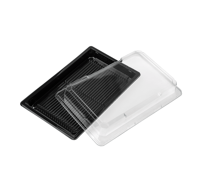 Sushi doboz tetővel szettben 163 x 113 x 17 mm Fekete 100 db alj +100 db tető összecsomagolva rPET